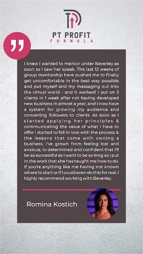 That’s exactly why I created the PT Profit Formula: designed to help you to build a pressure-free, permission-based sales system that gets you paid every day without begging or hustling for clients.